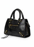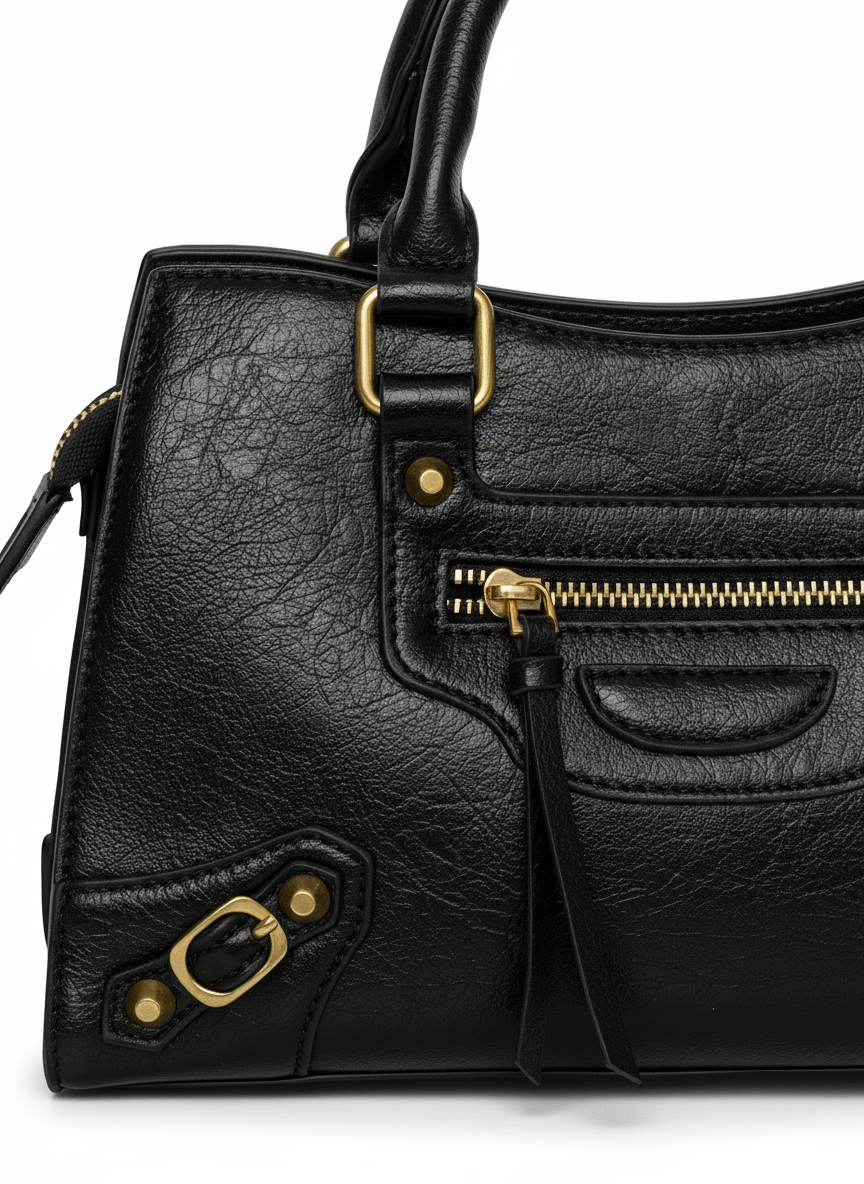 La Borsa ARIZONA è una top-handle strutturata con DNA urban. In materiale PU effetto grana con ferramenta dorata anticata, sfoggia tasca frontale con zip e tiralampo a nastro/laccio, pannello frontale con borchie, dettagli a staffa sugli angoli e doppi manici tubolari. Tracolla inclusa per indosso crossbody. Compatta ma funzionale, passa dal lavoro all’after-work con carattere.