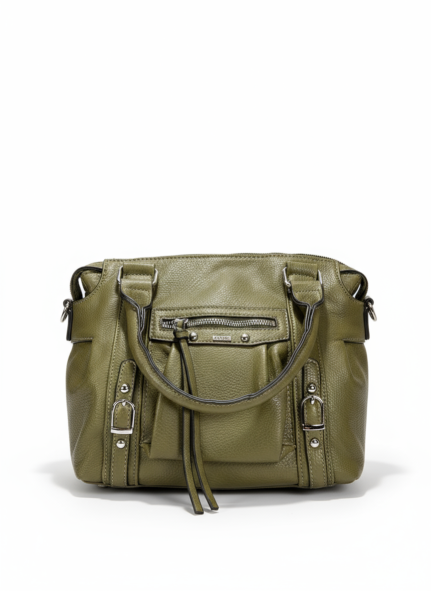 La Borsa City Satchel – Verde Oliva unisce DNA urban e funzionalità. In materiale PU a grana naturale con ferramenta argento, presenta tasca frontale con zip e tiralampo a laccio, doppi manici tubolari e dettagli a staffa sugli angoli. Tracolla lunga inclusa per indosso crossbody: compatta ma organizzata, perfetta dal lavoro all’after-work.