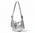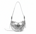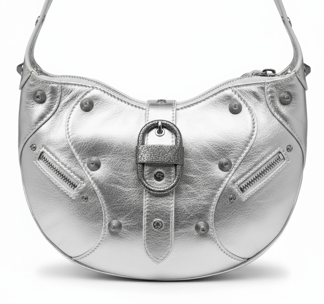 La Borsa JENNIFER è una mezzaluna dal carattere glam-rock. In materiale PU metallizzato argento con rivetti e profili sagomati, abbina zip superiore a fibbia centrale decorativa e laccetti che ne enfatizzano il movimento. La tracolla regolabile consente la doppia portabilità (spalla o corto cross). Perfetta per accendere ogni look, dal denim alla sera. Fatta a mano in Italia.