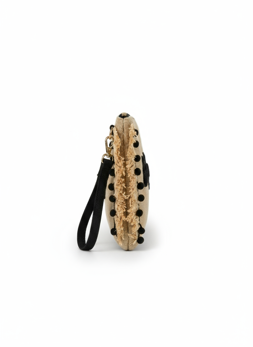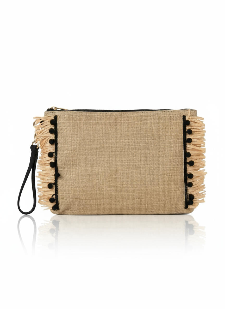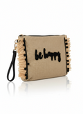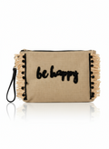 La Pochette Be Happy è la clutch estiva leggera e versatile. In juta/canvas naturale con profili e ricamo “Be Happy” a contrasto, è rifinita da frange in rafia e pompom laterali. Completa di polsiera e tracolla lunga rimovibile per passare dal polso al crossbody. Zip superiore per custodire l’essenziale: perfetta per mare, city-break e aperitivi.