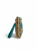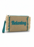 La Pochette Relax è la clutch da spiaggia/città leggera e giocosa. In juta/canvas naturale con profili e ricamo “Relaxing” tono aqua, presenta frange in rafia sui lati e polsiera removibile per portarla al polso. La zip superiore tiene al sicuro l’essenziale. Perfetta da sola per l’aperitivo sul mare o come pouch dentro la shopper.