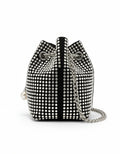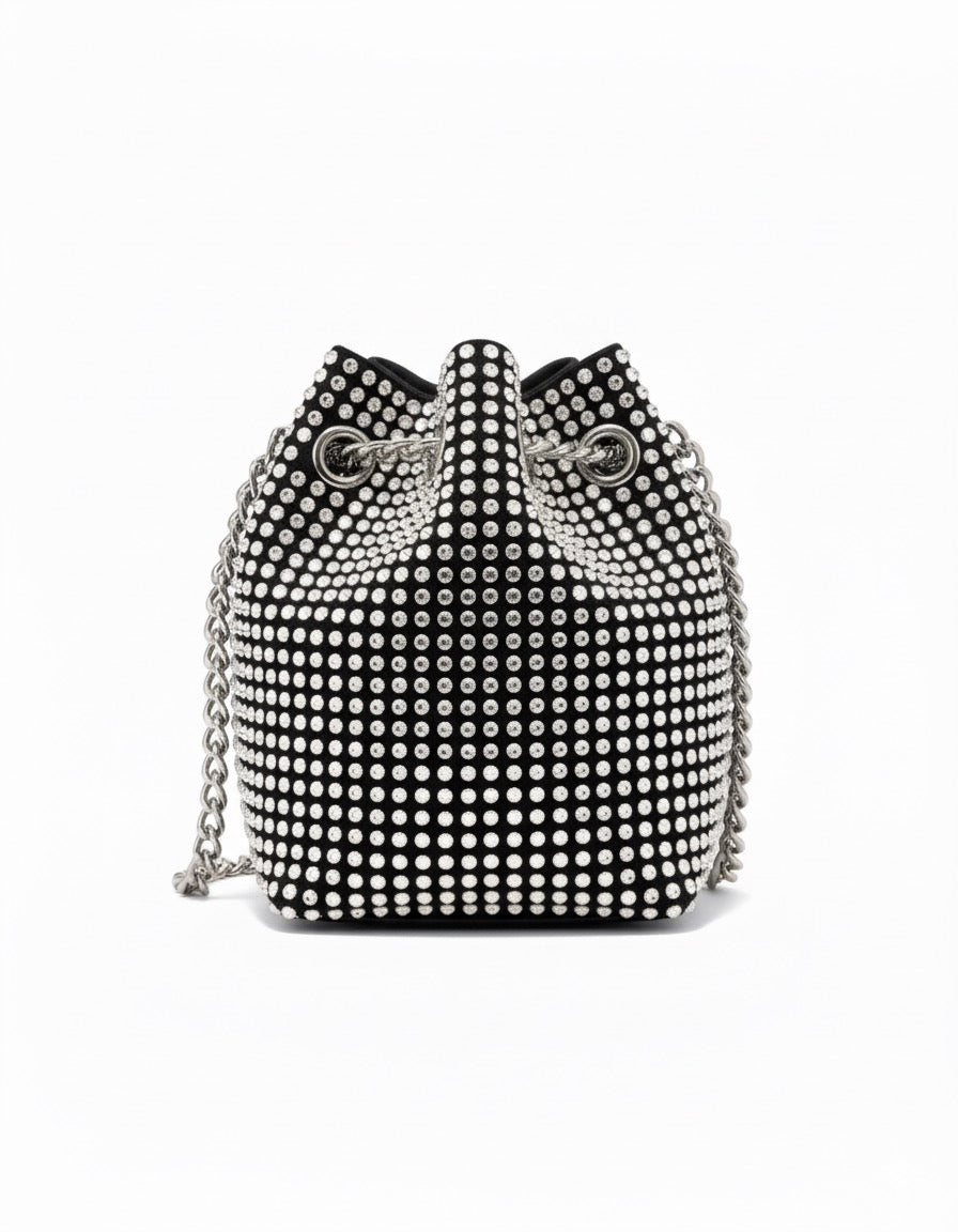 La Borsa SPARKLEY è una mini a secchiello pensata per brillare. In tessuto nero completamente rivestito di strass con ferramenta argento, presenta chiusura a coulisse con cordini a catena e terminali perlati. La tracolla a catena permette di indossarla a spalla o crossbody. Compatta e scenografica: perfetta per party, cene e occasioni speciali.
