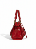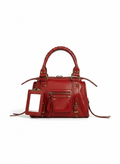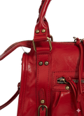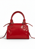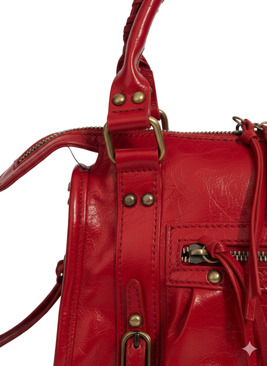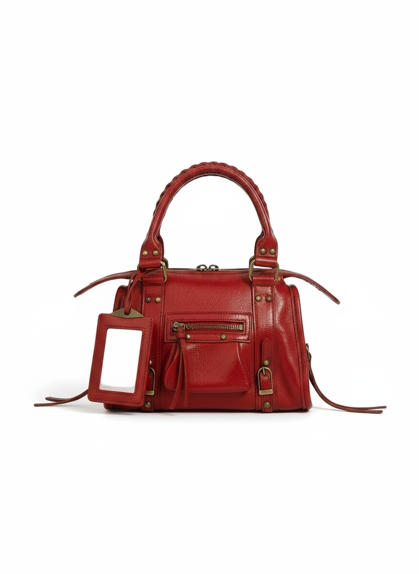 La Borsa Constance Mini 2.0 – Rosso è una top-handle compatta dall'attitudine urbana. In materiale PU a finitura lucida con borchie e minuterie ottone anticato , presenta zip superiore , tasca frontale con zip e tipici laccetti decorativi . I manici con intreccio a frusta offrono una presa comoda; il tag specchio removibile aggiunge carattere. Pratica di giorno, grintosa la sera. Fatta a mano in Italia.
