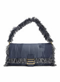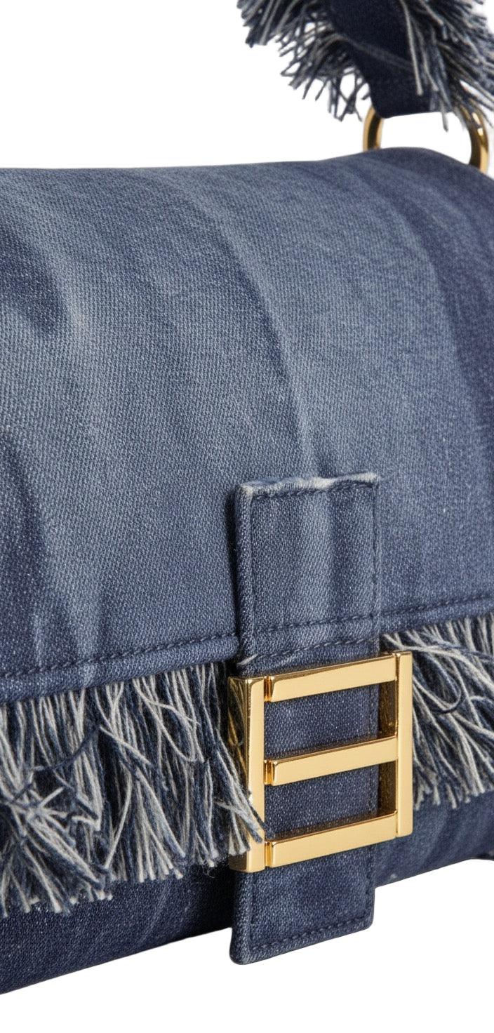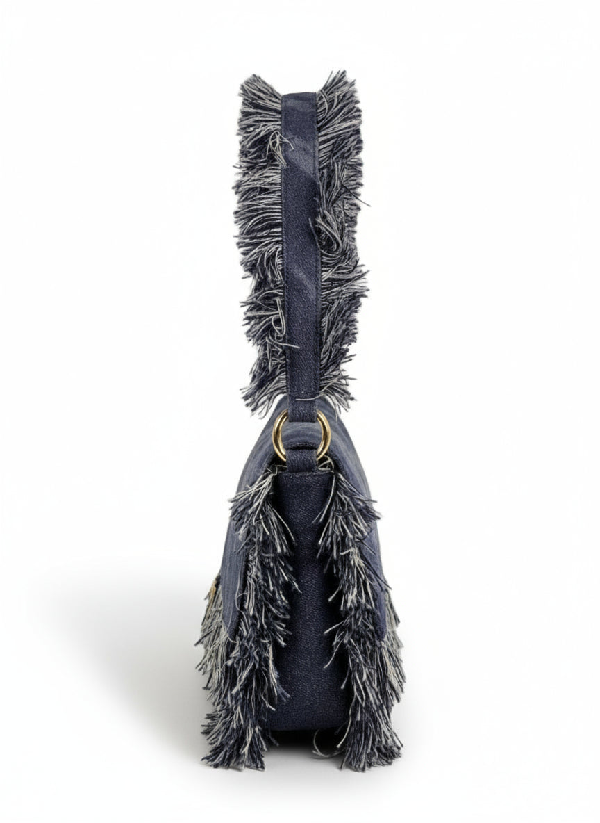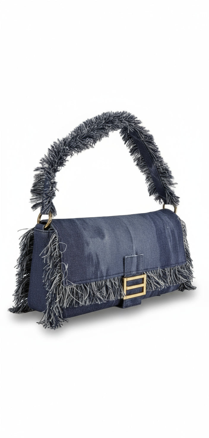 La Borsa JADE Denim è una spalla rettangolare dal twist couture. In tessuto denim blu con frange tono su tono su pattina, profili e manico, è rifinita da ferramenta dorata e buckle frontale scultoreo. La pattina copre l’apertura con magnete; silhouette sottile ma capiente per l’essenziale di giornata e sera.